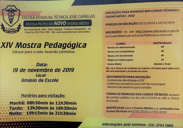Também poderá ser feita a inscrição para ingresso no novo ensino médio (a partir do 1º ano), modalidade de ensino que está sendo implantada pelo Ministério da Educação em todo o Brasil e será obrigatório a partir de 2022. O Cañellas é uma das 300 escolas no Rio Grande do Sul e das 11 da 20ª Coordenadoria Regional de Educação (20ª CRE) que serão piloto para a implantação do curso, já a partir de 2020.
