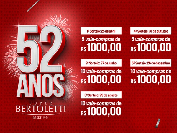 O Supermercado Bertoletti realiza neste sábado, 25 de abril, o primeiro sorteio da campanha especial de aniversário em comemoração aos 52 anos de história da empresa. A promoção vai distribuir, ao longo de 2026, um total de R$ 40 mil em vale-compras.