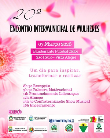 A 20ª edição do Encontro Intermunicipal das Mulheres acontece no próximo sábado, 7 de março, em Vista Alegre. Considerado um dos eventos mais tradicionais e representativos da região, o encontro de 2026 será realizado na comunidade de Linha São Paulo, no interior do município, marcando a celebração de duas décadas de integração, troca de experiências e valorização feminina.