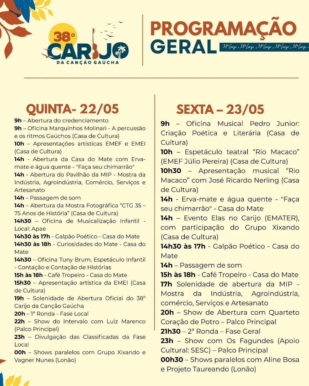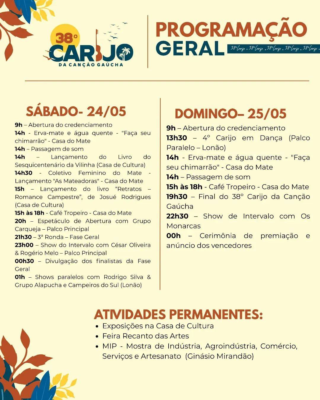 Nesta edição do 38º Carijo da Canção Gaúcha, o festival também contará com a realização da segunda edição do Carijo em Prosa e Verso, do 3º Carijo Instrumental, do 22º Carijinho e do 4º Carijo em Dança. A programação inclui ainda as atividades permanentes da Casa de Cultura, da Casa do Mate e da Mostra da Indústria, Agroindústria, Comércio e Artesanato de Palmeira das Missões (MIP).