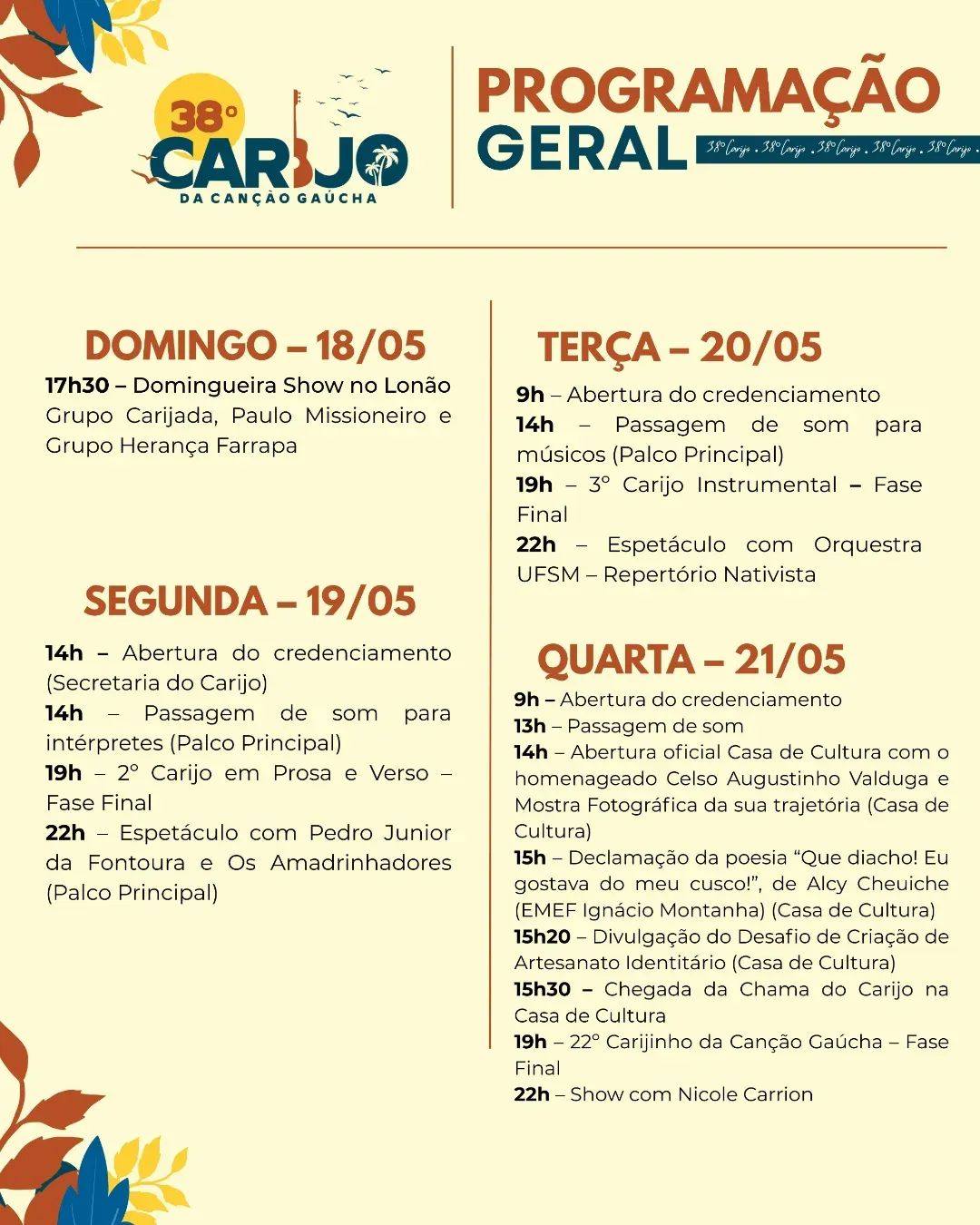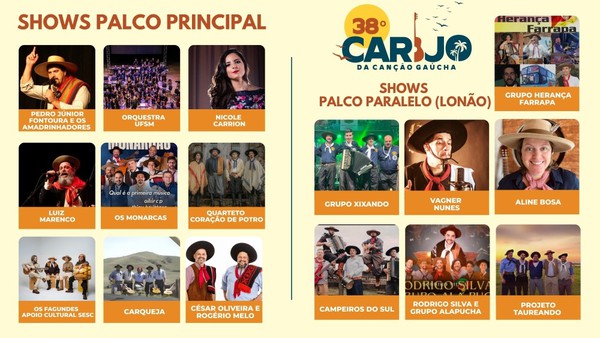 O 38º Carijo da Canção Gaúcha acontecerá de 18 a 25 de maio, no Parque de Exposições, com entrada gratuita.