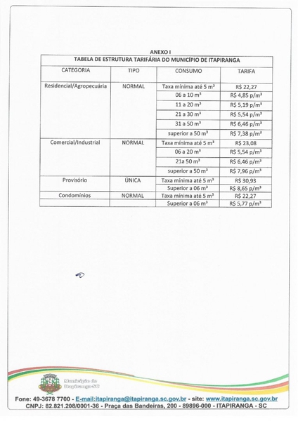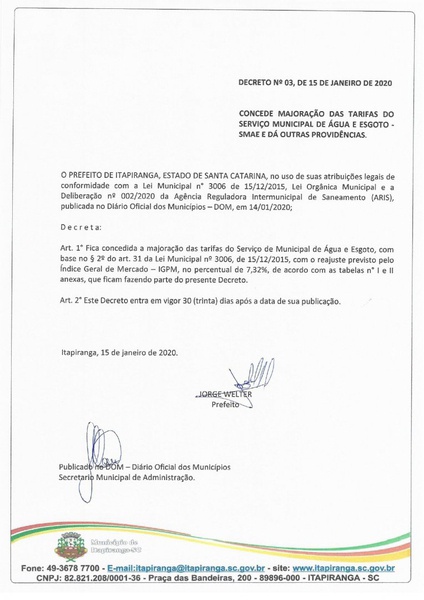 O Departamento Municipal de Água e Esgoto de Itapiranga (SC) informa que a partir de fevereiro de 2020, as tarifas de água e de serviços passarão por reajuste, de acordo com a Lei Municipal nº 3006 de 15/12/2015
