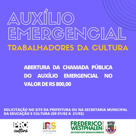 A secretaria Municipal da Educação e Cultura (Smec) lançou o Edital Frederico Cultural, que é um edital de chamamento público aos profissionais da cultura, para obtenção de auxílio emergencial, com recursos do co-investimento do Fundo de Apoio à Cultura (FAC RS), da Secretaria da Cultura do Estado do Rio Grande do Sul. O objetivo é distribuir o auxílio de R$ 800,00 em conta única para até 137 trabalhadores da cultura dos seus mais diversos segmentos e atuação.
