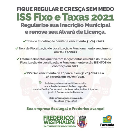 A Administração Municipal de Frederico Westphalen, através da Secretaria da Fazenda, informa que está aberto o prazo para pagamento do Imposto Sobre Serviços (ISS) Fixo e as taxas de Fiscalização Sanitária e de Localização e Funcionamento.