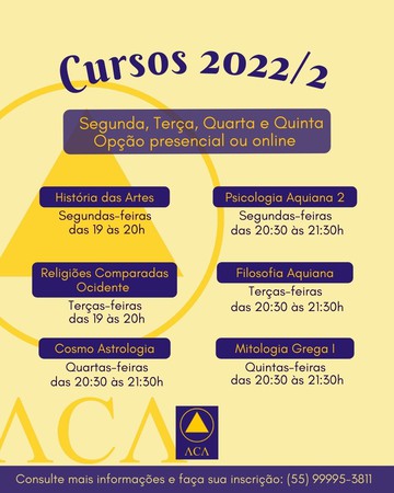 A Associação Cultural Atena (ACA), nos últimos anos, vem fortalecendo a área de formação cultural. Compondo os três pilares, junto à filosofia ativa e integração social, a formação cultural tem como objetivo desenvolver os cursistas em assuntos diversos, como psicologia, filosofia, arte, religiões e cosmo astrologia. Neste semestre, a ACA está abrindo inscrições para 6 cursos: História das Artes, Psicologia Aquiana 2, Religiões Comparadas Ocidente, Cosmo Astrologia, Filosofia Aquiana e Mitologia Grega.