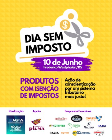 Organizada pelo Núcleo do Jovem Empreendedor da Associação Empresarial ACI/CDL, a ação Dia Sem Imposto acontecerá em Frederico Westphalen no próximo dia 10 de junho, com a participação de aproximadamente dez empresas locais. A ação é tradicional, realizada em todo o país e busca conscientizar as pessoas sobre a quantidade de tributos incidentes sobre produtos e serviços, levando a reflexão sobre a alta carga tributária no país e a devolutiva que a sociedade tem com os recursos aplicados nos diversos setores públicos.