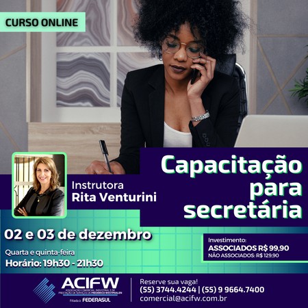 A capacitação é voltada aos profissionais que atuam como secretárias(os), recepcionistas, atendentes e pessoas que pretendam ingressar nessa área. O valor do curso para público-geral é de R$129,90 e associados da ACIFW ganham desconto e condição especial, ficando no valor de R$99,90. Para garantir a vaga, os interessados devem entrar em contato com a entidade, pelos telefones (55) 3744-4244, (55) 9.9964-7400 ou pelo e-mail comercial@acifw.com.br.