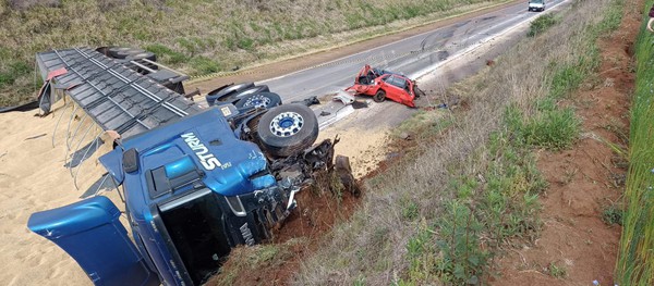 A carreta e o veículo - um gol - que trafegava no sentido contrário colidiram frontalmente. O motorista que estava no carro faleceu no local, ainda não há informações sobre demais vítimas. Com o tombamento da carreta o congestionamento no local é quilométrico. A Polícia Rodoviária Federal (PRF) pede que os motoristas não utilizem o trecho.