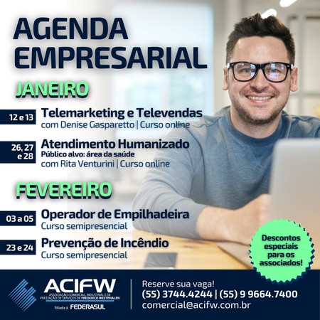 2021 começou com uma programação repleta de capacitações na Associação Comercial, Industrial e de Prestação de Serviço (ACIFW). A Agenda Empresarial reúne cursos e treinamentos online e semipresencial nas mais diversas áreas, com desconto exclusivo para empresas associadas e colaboradores.