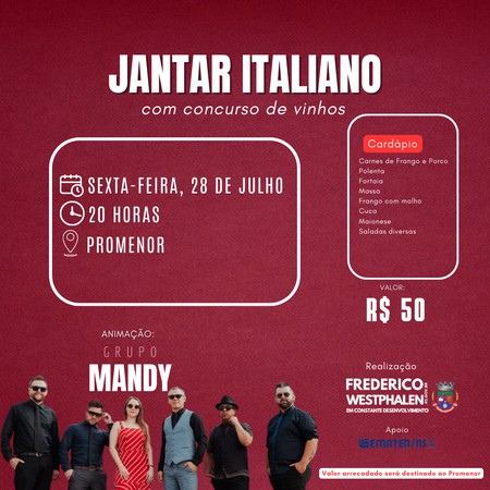 A segunda edição do Jantar Italiano e Concurso de Vinhos beneficente, realizado pela Administração Municipal de Frederico Westphalen, em parceria com a Emater, acontecerá no dia 28 de julho, às 20h. Neste ano, o valor arrecadado será destinado ao Promenor, garantindo qualidade no apoio às crianças frederiquenses.