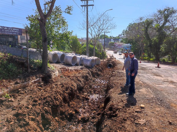 O prefeito de Rodeio Bonito, Paulo Duarte, e o secretário de obras, Odacir Ampese, acompanham os trabalhos de melhorias na infraestrutura do município na manhã de hoje, 7 de novembro. As ações estão sendo desenvolvidas no interior e na cidade, sendo que a ERS 587 está com obras de implantação de nova tubulação às margens da rodovia.
