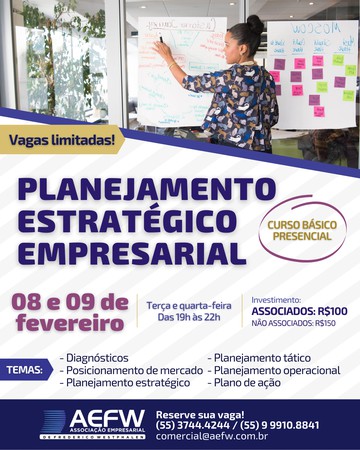 Para auxiliar as empresas locais no planejamento estratégico, a Associação Empresarial ACI/CDL de Frederico Westphalen (AEFW) está promovendo um curso básico de Planejamento Estratégico Empresarial em 8 e 9 de fevereiro, sede da entidade (formato presencial). Os temas desenvolvidos serão Diagnósticos, Posicionamento de Mercado, Planejamento Estratégico, Tático e Operacional, além do Plano de Ação.