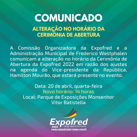 Através de um comunicado divulgado no último sábado, 16 de abril, a Administração de Frederico Westphalen e a Comissão Organizadora informaram a mudança de horário da abertura oficial da Expofred 2022. Inicialmente marcada para quarta-feira, 20 de abril, às 15 horas, a solenidade acontecerá às 14 horas.
