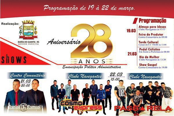 Celebrado no dia 20 de março, o aniversário de Barra do Guarita, neste ano o munícipio completa 28 anos de emancipação. Para comemorar Barra do Guarita divulgou a programação oficial do evento que começa no dia 19 e vai até o dia 22 de março.