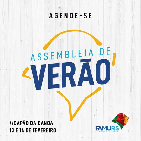A tradicional Assembleia de Verão da Famurs será realizada nos dias 13 e 14 de fevereiro de 2020, no Hotel Araçá, em Capão da Canoa. O encontro é voltado para prefeitos, vice-prefeitos, secretários e demais agentes municipais.