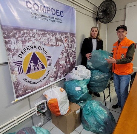 A Defesa Civil recebeu através de ação do Sesc Frederico Westphalen, aproximadamente 700 peças de doações entre roupas e calçados na campanha de agasalhos organizada pela instituição. A Secretária Carla Veronese recebeu as doações na manhã desta terça-feira (14) através do Coordenador Municipal da Defesa Civil do município, Gilberto de Souza. Ainda segundo o coordenador, a ação de recebimento de doações no Sesc continuam. Foram recebidas nesta semana também cerca de 150 peças através de ação desenvolvida pelas duas agências Sicredi.