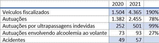 As autuações também aumentaram, passando de 237 para 455 (acréscimo de 92%). As multas por ultrapassagem indevida subiram de 54 para 99 (aumento de 83%). E o maior aumento foi nas multas envolvendo alcoolemia ao volante 111% - passando de 9 para 19. Os acidentes diminuíram de 6 para 4 e o número de pessoas feridas diminuiu de 12 pra 7. Tanto em 2020, quanto em 2021 não foram registradas mortes na região. O número de pessoas presas passou de 2 para 3, comparando os anos de 2020 e 2021.