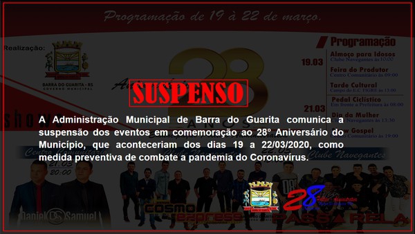 A Prefeitura de Barra do Guarita divulgou nesta terça-feira, 17 de março, um Comunicado informando o cancelamento da programação alusiva aos 28 anos de emancipação político-administrativa do município. As atividades ocorreriam entre a quinta-feira, 19 de março, e o domingo, 22 de março.