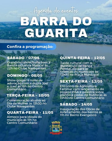 O município de Barra do Guarita celebrou 30 anos de emancipação político-administrativa no dia 20 de março. Para comemorar com a comunidade, a Administração do município organizou uma agenda de eventos no mês de maio, confira a programação: