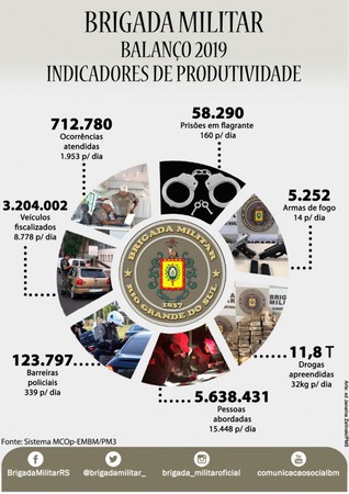 De acordo com o Comandante geral da Brigada Militar, Coronel Rodrigo Mohr Picon, os números apresentados são os indicadores de produtividade que demonstram em números o empenho da corporação em ser uma polícia ativa e que atua, sobretudo, para coibir crimes. "Esses dados não são apenas números. Eles carregam consigo uma redução efetiva nos índices de criminalidade e aumentam a sensação de segurança da população. São 497 municípios atendidos diariamente pela instituição que através desses números comprova que 24 horas por dia, sete dias da semana a sua segurança é o que nos move", disse.