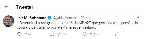 O presidente Jair Bolsonaro anunciou, no início da tarde desta segunda-feira, 23 de março, no Twitter que revogou o art.18 da MP 927, que permitia a suspensão do contrato de trabalho por até 4 meses sem salário. O Artigo 18 previa que, durante o estado de calamidade pública, o contrato de trabalho poderia ser suspenso por até quatro meses, para participação do empregado em curso de qualificação profissional não presencial, oferecido pela empresa ou por outra instituição. Essa suspensão poderia ser acordada individualmente com o empregado e não depende de acordo ou convenção coletiva.