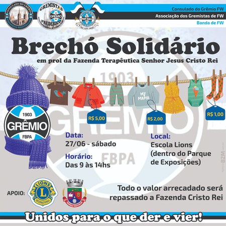 Promovido pela Associação dos Gremistas, com o apoio da Administração Municipal de Frederico Westphalen, Lions Clube e Comunidade Terapêutica Fazenda Senhor Jesus Cristo Rei, o Brechó Solidário previsto para ocorrer no sábado, 27 de junho, foi cancelado.