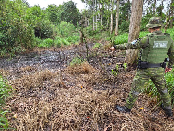 Já em outro local, a equipe do 3º BABM flagrou um grande volume de dejetos de suínos lançados diretamente sobre o solo. A poluição atingiu uma área de mata nativa e um garimpo desativado. Em contato com os responsáveis, estes informaram que as esterqueiras vazaram, ocasionando a poluição.