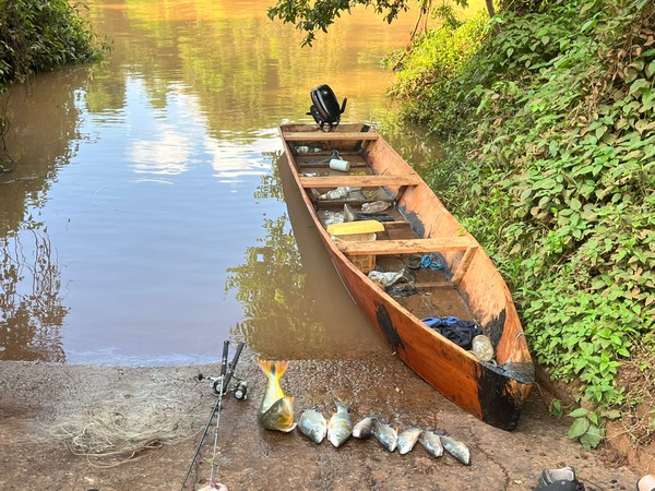 Durante patrulhamento embarcado no período de defeso — a Piracema —, os policiais abordaram uma embarcação de madeira sem registro e com motor acoplado, tripulada por quatro estrangeiros que realizavam pesca ilegal dentro do Parque Estadual do Turvo.