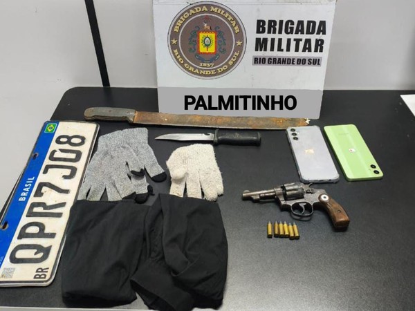 Na tarde de segunda-feira, a Brigada Militar prendeu três indivíduos após abordagem a um veículo em atitude suspeita, na cidade de Palmitinho. Durante a ação, foi apreendido um revólver calibre .32, 6 munições intactas, além de facão, faca, luvas, celulares e vestimentas adaptadas como balaclavas, que seriam um tipo de capuz que cobre a cabeça, pescoço e parte do rosto, deixando apenas os olhos visíveis.
