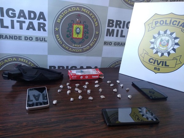 Na ação foi apreendido 27 pedras de crack, dois telefones celulares e um coldre - contendo uma pistola de cola quente, fazendo parecer uma arma de fogo.
