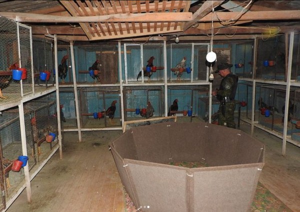 O homem não se encontrava na propriedade e, ao realizar a vistoria, a guarnição flagrou, no interior de um galpão de madeira, gaiolas individuais, contendo 30 galos, da raça combatente - utilizados para a prática criminosa de rinha. No local, havia um tambor, também chamado de “rinhadeiro” - espécie de arena onde são colocados os galos para a briga. Na área externa, foram encontradas gaiolas com 11galinhas.