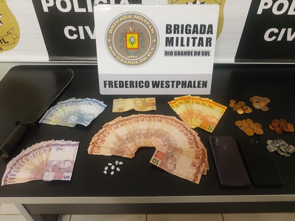 A dupla foi flagrada comercializando entorpecentes, sendo apreendidas 8 pedras de crack, R$ 699,30, dois celulares, além de um facão com aproximadamente 30 cm de lâmina.