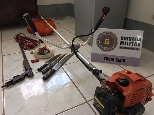 Um homem de 24 anos de idade e um adolescente de 17 foram apreendidos com os objetos furtados, uma espingarda e três facões.