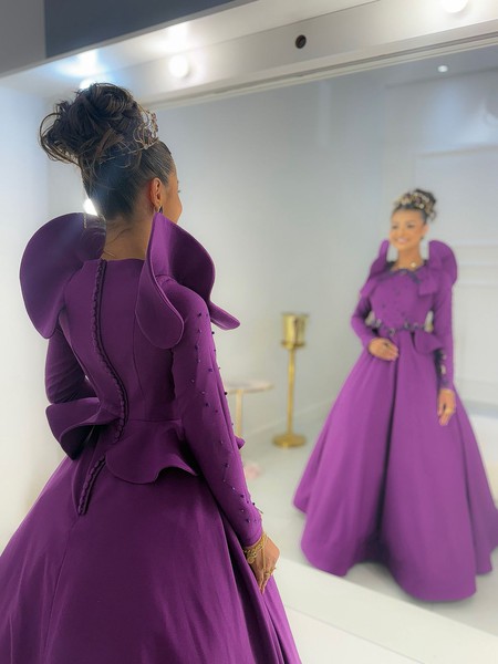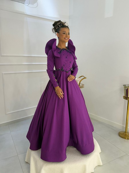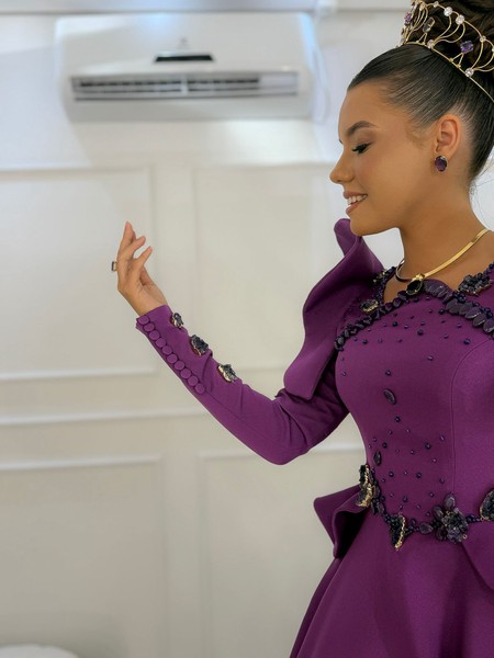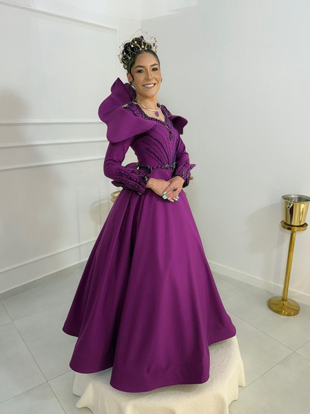 Brilho da ametista inspira vestidos das soberanas da Expopedras