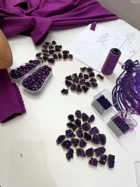 Os bordados, minuciosos e detalhados, incorporam ametistas naturais aplicadas às peças, criando pontos de brilho que remetem às formações cristalinas. Cada elemento foi pensado para dialogar com a história da extração, da lapidação e da transformação da pedra, atividades que moldam a identidade econômica e cultural de Ametista do Sul.