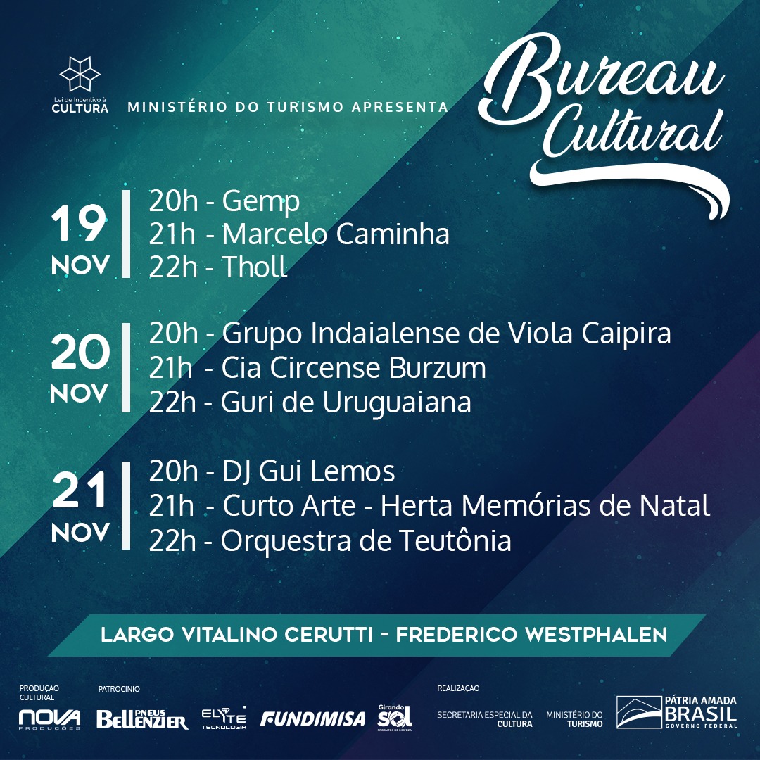 O Bureau Cultural inicia na sexta-feira (19), às 9h30 com a oficina do violão gaúcho com Marcelo Caminha. A noite as atrações iniciam partir das 20 horas com o espetáculo “Gemp”, a partir das 21 horas terá show de Marcelo Caminha e para encerrar a noite às 22 horas o grupo Tholl apresenta seu espetáculo.