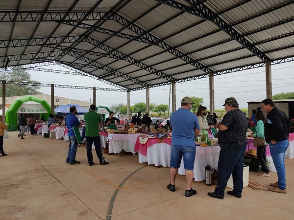 Estão sendo expostas as produções das propriedades rurais, como peças de artesanato e produtos das agroindústrias e comércio local.