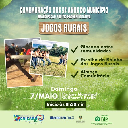 O evento Jogos Rurais, organizado pela Administração de Caiçara, Emater-RS/Ascar e Sindicato dos Trabalhadores Rurais, está sendo organizado para celebrar os 57 anos de emancipação político-administrativa do município. Para isso, estão sendo realizadas reuniões com as comunidades para organização das atividades.