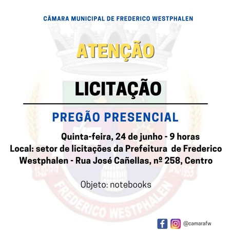 A Câmara Municipal de Frederico Westphalen está com processo de licitação para aquisição de notebooks. O Pregão Presencial, com abertura dos envelopes, acontece no dia 24 de junho, às 9 horas, e terá como forma de julgamento o menor preço por item.