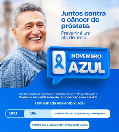 A caminhada terá início nas proximidades da Rice, seguindo pelo Caminhódromo até a Praça do Imigrante, onde será realizada uma palestra com o urologista Dr. Talvã Norberto.
