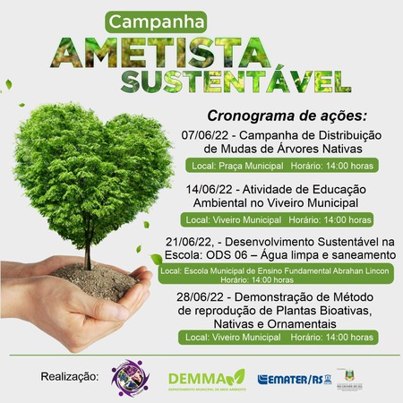 A campanha “Ametista Sustentável” é uma iniciativa do Poder Público Municipal, através do Departamento Municipal de Meio Ambiente, em Parceria com a Emater/Ascar-RS.A ação tem como principal objetivo, sensibilizar a comunidade ametistense sobre a importância de preservar os diferentes tipos de ecossistemas, promovendo ações de proteção e preservação do meio ambiente.