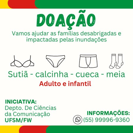 Professores dos Departamento de Ciências da Comunicação da Universidade Federal de Santa Maria, campus de Frederico Westphalen, lançaram campanha de arrecadação de roupas íntimas (sutiãs, calcinhas, cuecas e meias, tamanhos adulto e infantil) para doação às vítimas dos eventos climáticos que atingem o estado do Rio Grande do Sul. A campanha estimula a arrecadação de peças que não costumam ser doadas, mas que são fundamentais aos desabrigados.
