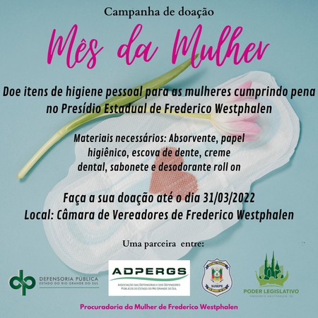 Instituída na Sessão Ordinária da quarta-feira, 2, a Procuradoria Especial da Mulher, comandada pelos vereadores Aline Ferrari Caeran e Raul Pazuch da Silva, já está desenvolvendo uma de suas primeiras iniciativas. Trata-se de uma campanha de doação alusiva ao Mês da Mulher, em que a comunidade poderá contribuir com itens de higiene pessoal para as mulheres que estão cumprindo pena no Presídio Estadual de Frederico Westphalen.