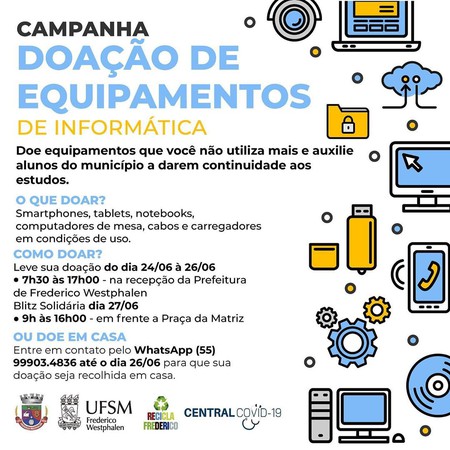 A UFSM-FW lançou uma campanha para arrecadar equipamentos eletrônicos em condições de uso como smatphones, notebooks, tablets, computadores de mesa, carregadores e cabos em bom estado para serem doados a estudantes que estão enfrentando dificuldade para ter acesso aos estudos remotos por conta da pandemia do coronavírus. A campanha tem parceria com projeto Recicla Frederico.