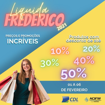 A 17ª edição do Liquida Frederico inicia hoje, dia 1ª de fevereiro, e se estenderá até o próximo sábado, 6, encerrando com o Sabadão dos Negócios. A ação é organizada pela Câmara de Dirigentes Lojistas (CDL-FW) em parceria com a Associação Comercial, Industrial e de Prestação de Serviço (ACIFW).