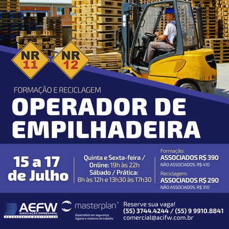 Nos próximos dias 15, 16 e 17 de julho, a Associação Empresarial ACI/CDL de Frederico Westphalen (AEFW), em parceria com a empresa Masterplan, está promovendo a capacitação para Operador de Empilhadeira (NR11 e NR12) nas modalidades formação e reciclagem. As NRs são requisitos relativos à segurança e medicina do trabalho e são de observância obrigatória pelas empresas privadas e públicas que possuam empregados regidos pela CLT.