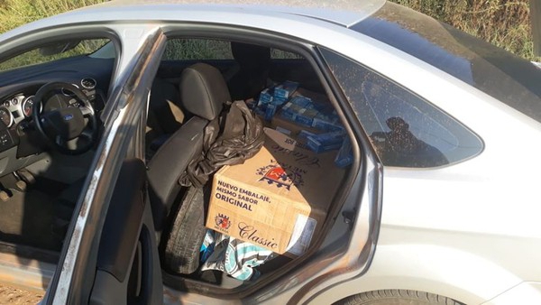 Os policiais realizaram a abordagem do veículo Ford/Focus, e constataram que era transportado em torno de 598 pacotes de cigarros da marca "clássic", e um pacote marca "Hudson" ambos de origem Paraguaia.
