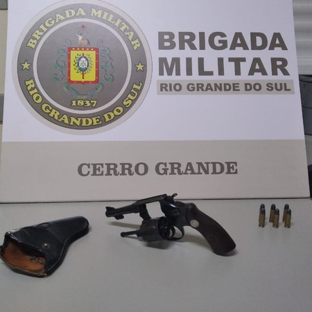 A Brigada Militar se deslocou até a residência onde foi encontrado e apreendido a arma de fogo revolver calibre 32 e seis munições de propriedade do acusado, que não estava mais no local.