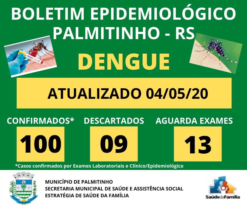 Chegou a cem o número de casos confirmados de dengue em Palmitinho. A informação consta no Boletim Epidemiológico divulgado pela Secretaria de Saúde há poucos instantes.