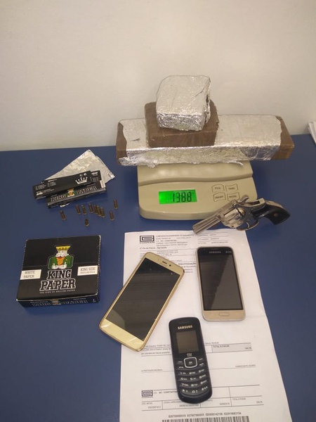 Nas residências, foram apreendidos um revólver calibre .22, diversas munições, 1,388 kg de maconha, uma caixa de papel seda, três celulares, dentre outros objetos.
